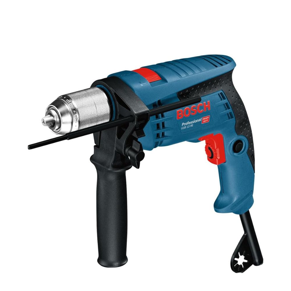 Trapano compatto con percussione a filo ad 1 velocità di livello, pratico, maneggevole e resistente, grazie anche al durevole mandrino autoserrante in metallo.