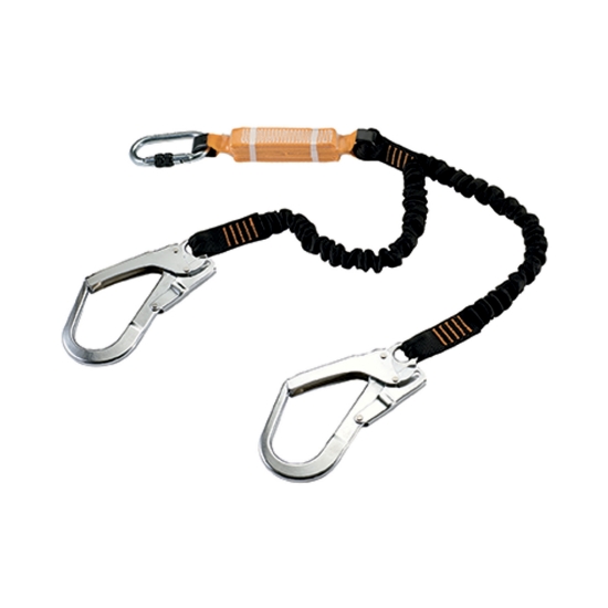 Cordino anticaduta elastico con elevato rapporto di allungamento. I due connettori ad ampia apertura con leva di sicurezza cosentono di progredire ancorando in maniera alternata i cordini, mantenendo in sicurezza l'operatore.