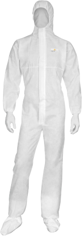 Tuta monouso di tipo 5, impermeabile alle particelle asciutte con buona traspirabilità.
