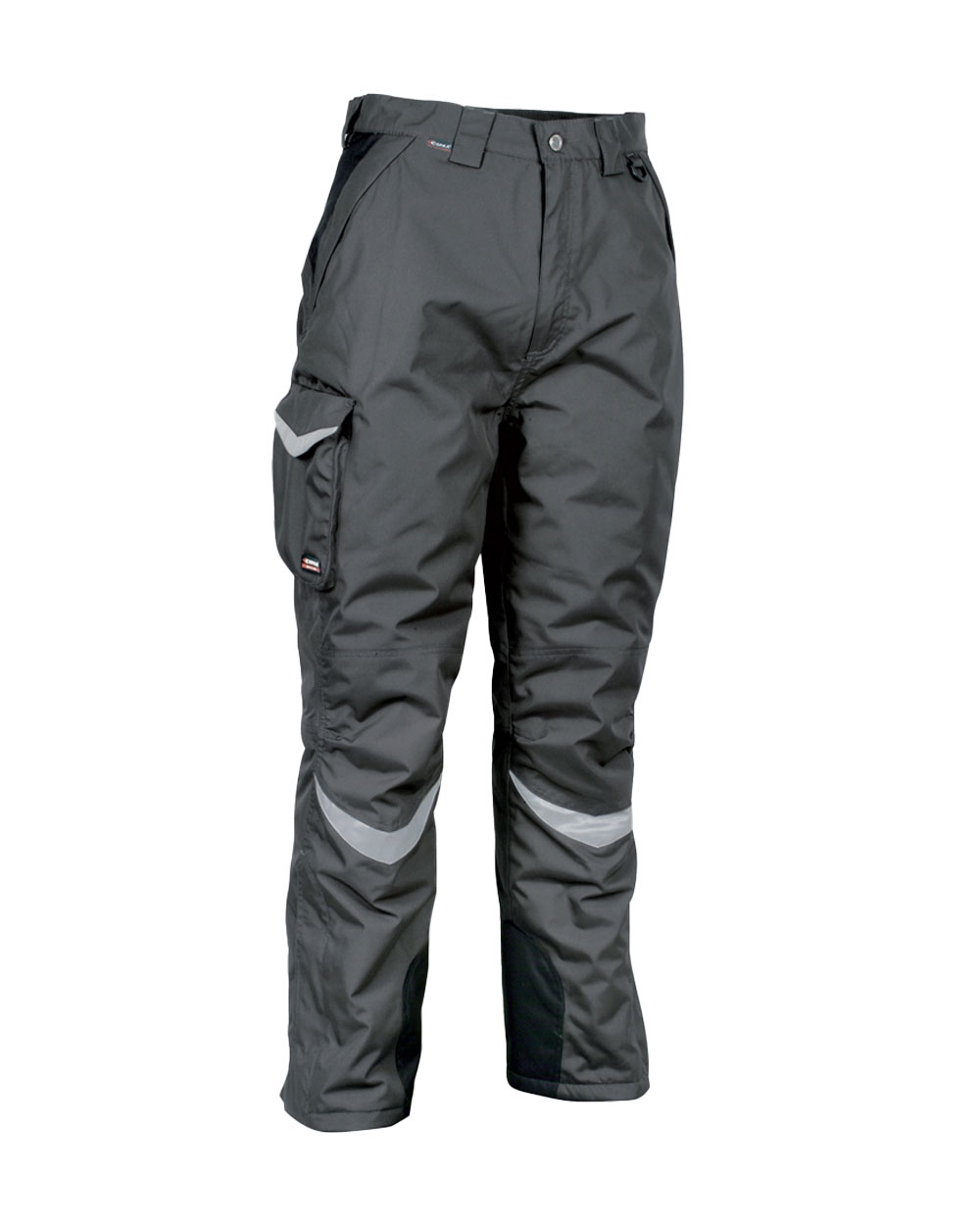 Pantalone da lavoro con ampia tasca posteriore con chiusura zip, apertura zip sul fondo e ghette impermeabili, doppia tasca posteriore con pattina, fondo pantaloni rinforzato, inserti rifrangenti, taglio ergonomico di gambe e ginocchia, tasca laterale destra, termonastratura, toppe di rinforzo alle ginocchia, vita regolabile, zip YKK.