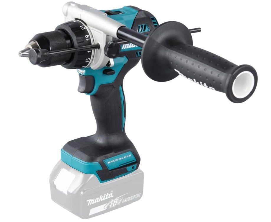 Il trapano avvitatore a percussione 18v Bushless Makita DHP486Z è fornito con impugnatura supplementare.